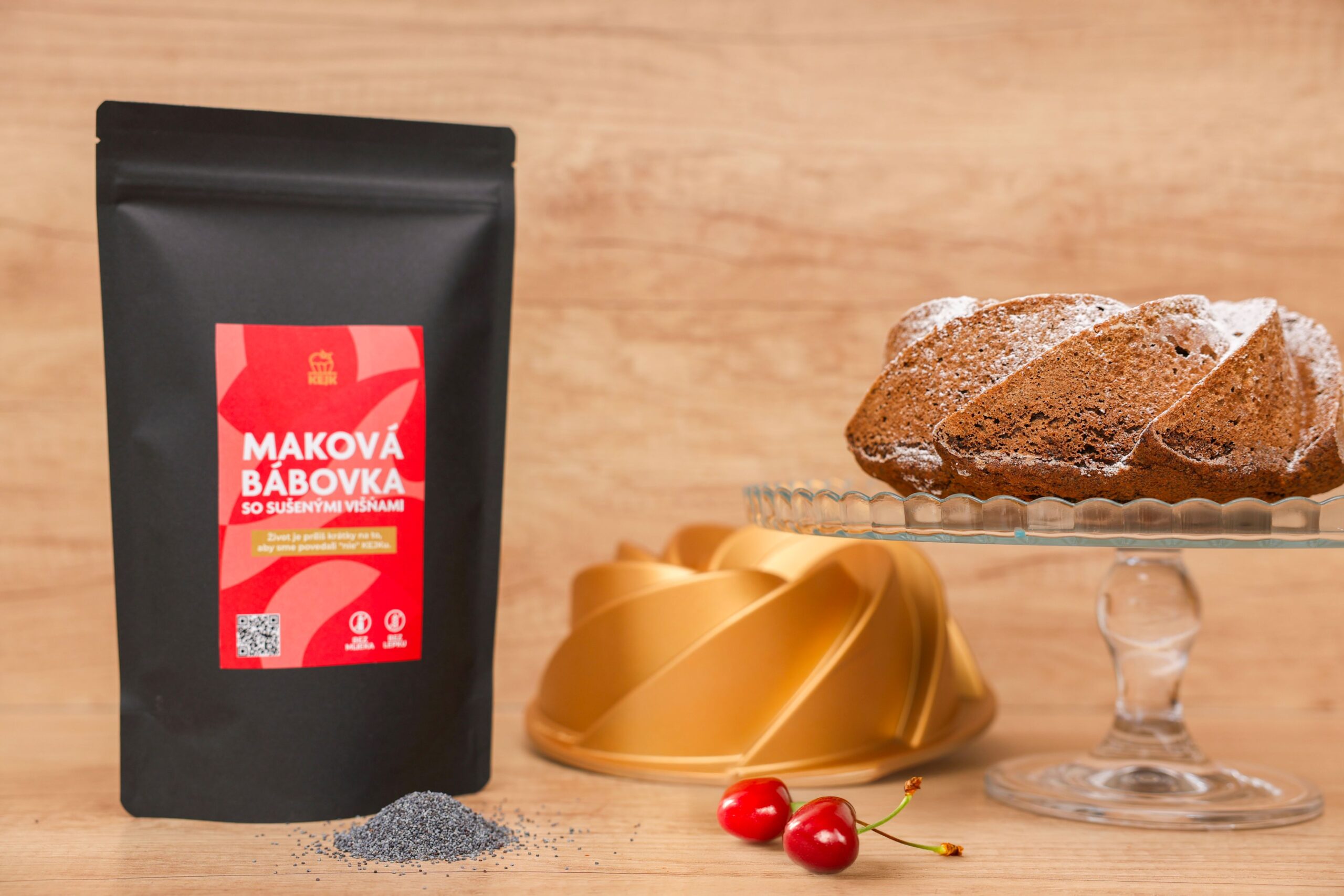 maková múka, mak modrý, trstinový cukor, sušené višne (višne, cukor, fruktózovo-glukózový sirup, citrónový koncentrát, slnečnicový olej), sóda bikarbóna, bezgluténová zmes (kukuričný škrob, ryžová múka, kukuričná múka, kypriace látky: hydrogénuhličitan sodný a difosforečnan disodný, stabilizátor: karboxymetyl celulóza)